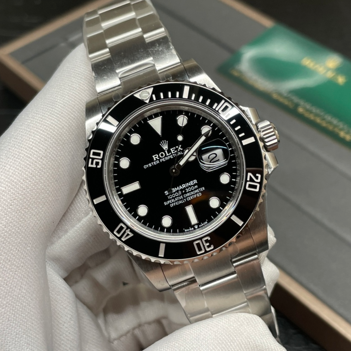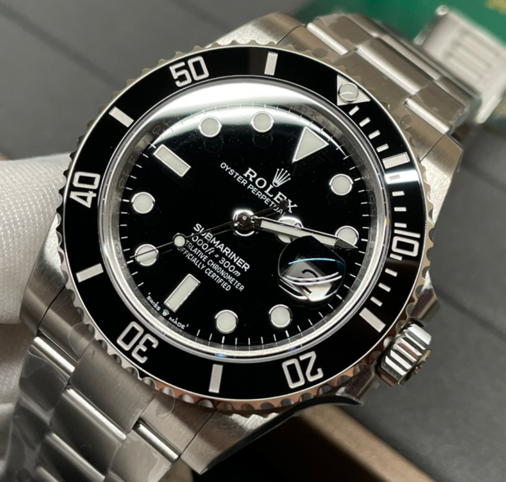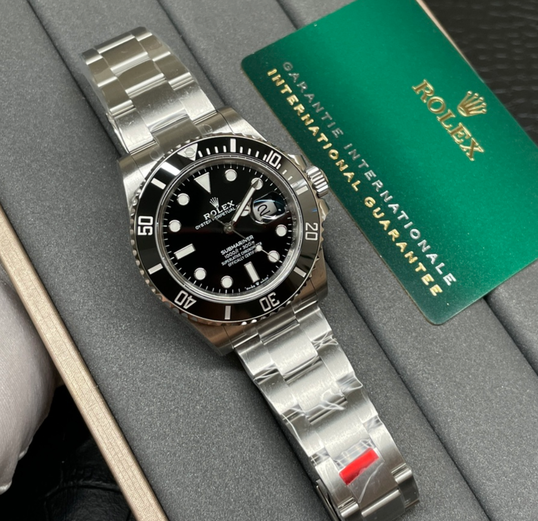 Rolex Submariner Date – El reloj de buceo por excelencia. Caja Oystersteel de 41 mm, bisel cerámico negro, esfera negra y movimiento automático calibre 3235. Resistente al agua hasta 300 m, combina funcionalidad profesional con elegancia atemporal.